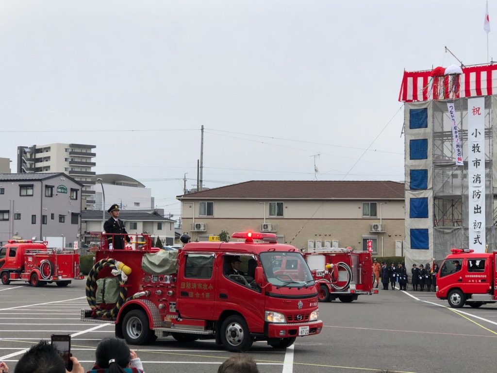 1月12日、市民会館駐車場で小牧市消防出初式が開催されました。日頃より小牧市を安全で住みよい街づくりに活躍いただいております、消防署、消防団、女性消防団、婦人消防クラブ、自主防災会、事業所自衛消防隊、航空自衛隊の方々をはじめ、消防関係団体約400名の参加があり、盛大に執り行われました。私自身も、昭和59年から平成13年までの17年間、小牧市消防第一分団に所属しており、久しぶりの出初式でした。第一分団長に話しを聞いたところ、若手の消防団員大募集ということでした。大変寒い中、皆様本当にお疲れ様でした。