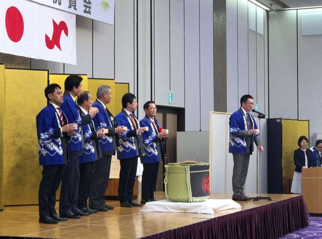 令和2年1月9日(木) 名鉄小牧ホテルにて小牧商工会議所主催 2020年賀詞交換会 叙勲受章祝賀式が盛会裏に開催されました。開会にあたり、小牧商工会議所女性会太鼓同好会「吉乃」さんの素晴らしい太鼓の演舞がありました。また、叙勲されました舟橋隆夫様、おめでとうございました。