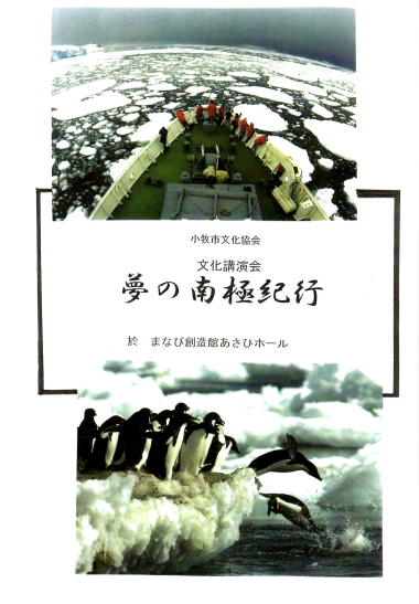 令和3年3月18日(木)午後1時30分より、小牧市文化協会主催の文化講演会が「まなび創造館あさひホール」に於いて開催され、参加させて頂きました。講師は、元小牧市議会議長の川島公子氏。演題は「夢の南極紀行」~氷河とペンギンの聖域~。川島講師の2度にわたる南極体験紀行で、美しい画像と稀有な体験談であっと言う間の1時間でした。南極をこよなく愛する川島講師と南極観測船「宗谷」との関係には大変驚きました。川島講師は、御年80歳と言われていましたが、全く年齢を感じさせない講演でした。頭が下がります。