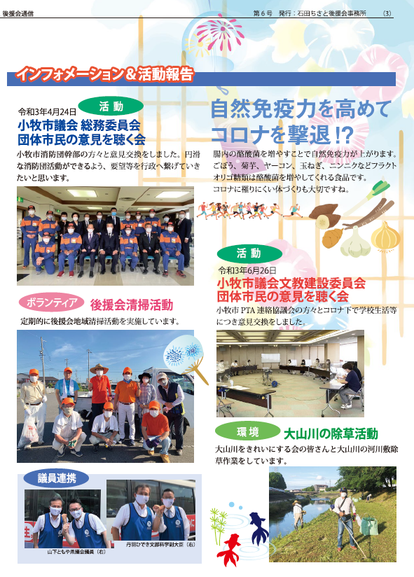石田ちさと後援会通信No.6を発行しました。約半年ぶりの発行となりました。SDGsと持続可能な地域農業をめざしてと題しての挨拶。市議会での一般質問の概要報告。議員活動や後援会等の報告と本市のインフォメーションなどが掲載されています。自然免疫力を高めてコロナを撃退では、最近書籍を読み、とても良い内容でしたので紹介させていただきました。次回は、来年、年明けとなります。今週から、暑さに負けず頑張って配布しています。