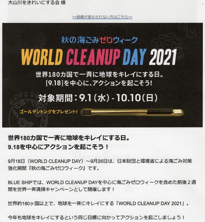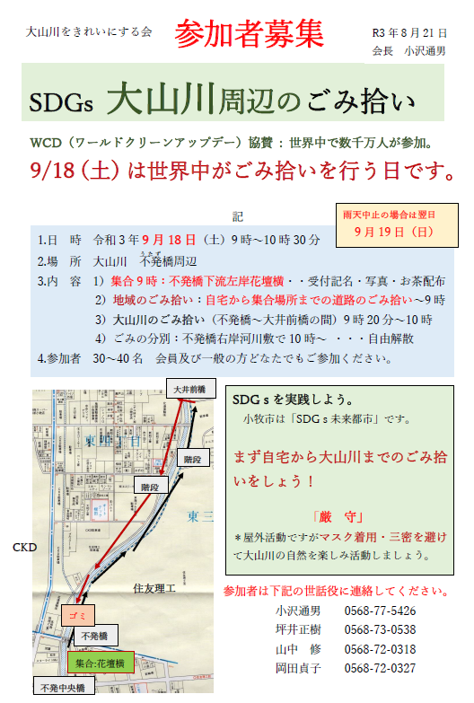 「大山川をきれいにする会」では、令和3年9月18日(土)午前9時から大山川周辺のごみ拾いを実施します。今回は、World Cleanup Day 2021(世界中で数千万人が参加) に協賛しての開催となります。内容として、まず、自宅から大山川までのごみ拾い、その後、大山川河川敷等のごみ拾いとなります。自身も、後援会や地元婦人会の皆さんと定期的にごみ拾いを行っています。SDGsとして環境保全も大切だと考えています。皆様のご参加お待ちしています。