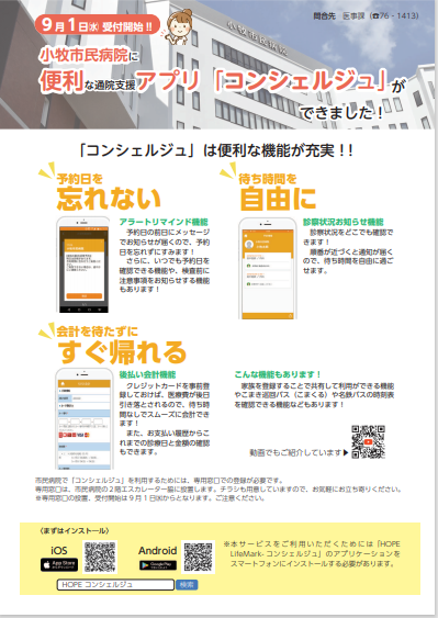 令和3年9月1日からスマホ用通院支援アプリ「コンシェルジュ」の運用が始まります。主な機能として①「アラートリマインド機能」②「診察状況お知らせ機能」③「らくらく会計機能」④「家族登録機能」などがあります。診察の待ち時間や会計の待ち時間解消や院内混雑の対応にも有効です。