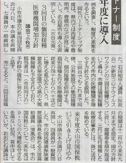 令和3年12月8日(水) 小牧市議会令和3年第4回定例会にて、2件の一般質問を行いました。質問項目1 (新型コロナウイルスワクチン接種事業の状況と今後について)