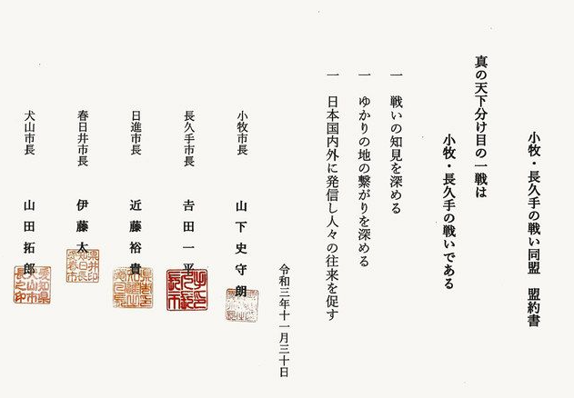 小牧・長久手の戦いは、1584年、豊臣秀吉と徳川家康・織田信雄連合軍が戦った合戦です。そのゆかりの地として、小牧市、長久手市、日進市、春日井市、犬山市の5市が同盟を結成し、協力して情報発信を始めるとのことです。2023年放送予定の大河ドラマ「どうする家康」でも小牧山などが舞台となると思われますので、大いにPRしていただきたいと思います。因みに、私の住んでいる北外山でも、当時の砦跡があります。