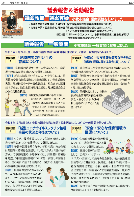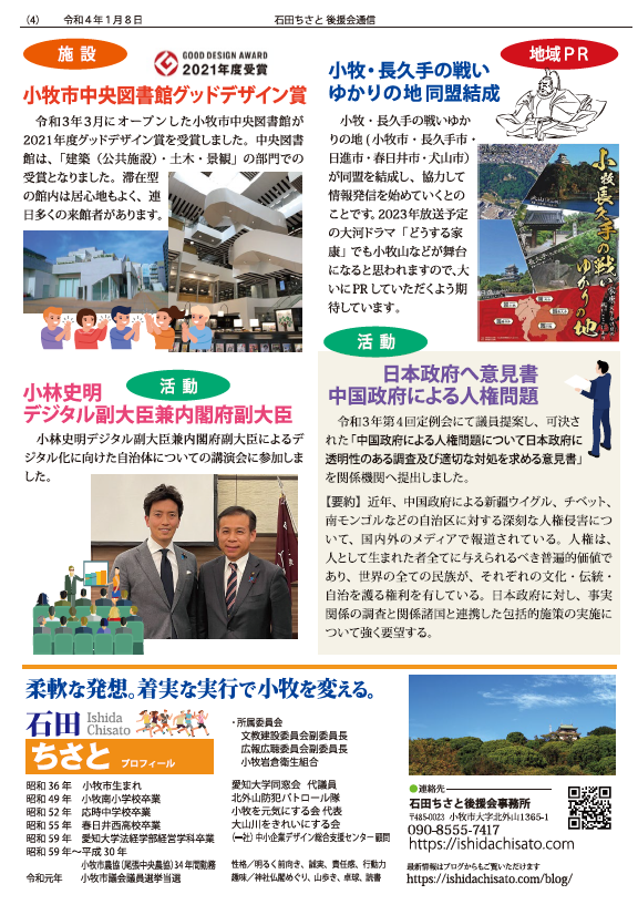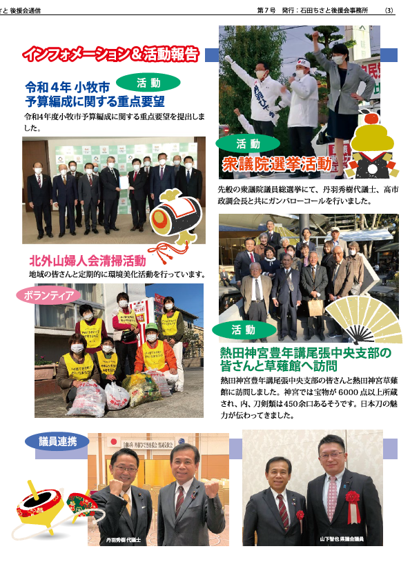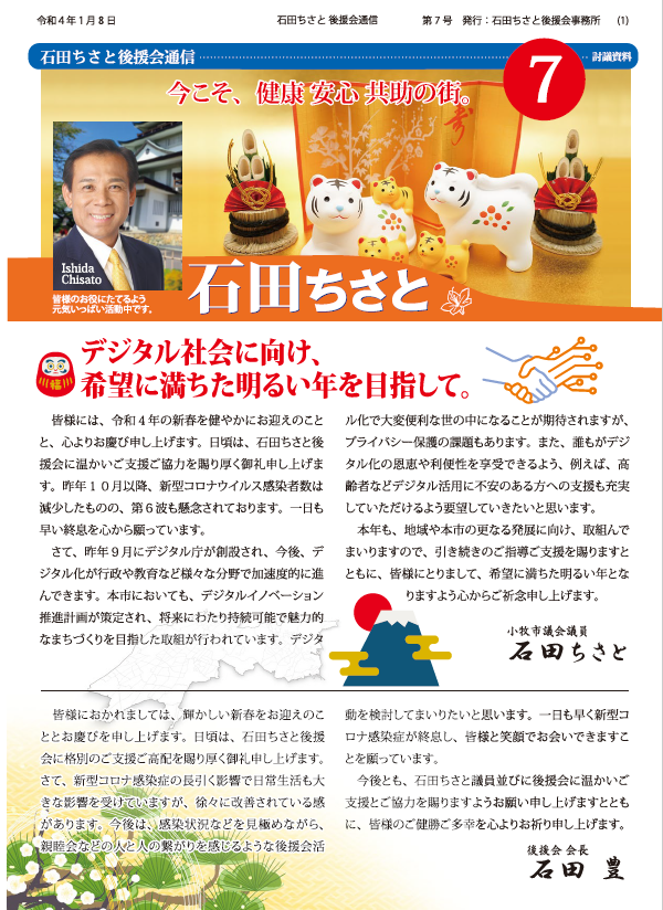 石田ちさと後援会通信No.7を発行しました。デジタル社会に向け、希望に満ちた明るい年を目指してと題しての挨拶。市議会での一般質問の概要報告。議員活動や後援会等の報告と本市のインフォメーションなどが掲載されています。先般の衆議院選挙では、各会場でガンバローコールをさせていただき、高市早苗政調会長とのガンバローコールは大変盛り上がったと感じています。今年こそコロナが終息し、平穏な日々が戻りますようお祈り申し上げます。