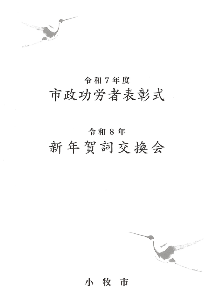 令和8年1月6日(火)小牧市公民館講堂にて、令和7年度市政功労者表彰式 令和8年新年賀詞交換会が開催されました。永年にわたり各界にてご貢献をいただき表彰受賞されました方々、おめでとうございます。新春にあたり、本市のますますの発展繁栄をご祈念申し上げます。一年間宜しくお願い申し上げます。